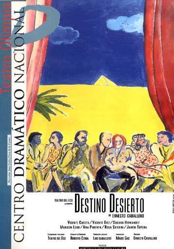 Destino desierto es una producción de teatro del Eco con la colaboración de la Comunidad de Madrid (Consejería de Educación y Cultura) y el INAEM (Ministerio de Educación y Cultura). Estrenado el 19 de octubre de 1996 (en cartel hasta el 17 de noviembre) en la Sala Olimpia (Centro Dramático Nacional), Madrid. Cualquier creación es un acto de liberación, mediante la fidelidad del hombre a su estructura interna. El hombre es libre, la llamada chispa divina no es más que eso. La libertad está en mí y yo estoy ligado a ella. Esto siempre saldrá a la superficie, como el aceite. Da igual lo que hagamos; alguna vez seremos libres. No en esta vida, no en la siguiente, pero alguna vez seremos libres. Inevitablemente. |
