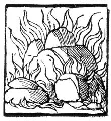 Y aún en esta ysla está la montaña de Ethna, que continuamente se quema y arde, la qual es llamada "Mongibel" y también es cerca de Bulcan, el qual continuamente se quema. Y allí ay una gran caverna quemante que echa diversas llamas y colores, y por el mudamiento de aquellas flamas conoscen los de aquella tierra quándo será tiempo caro o barato, o frío o caliente, humido o seco, y en todas las maneras quando el tiempo se muda.