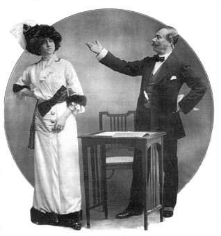 El actor Santiago con la actriz Pérez de Vargas en una escena del segundo acto de la obra Genio y Figura, original de los autores Arniches, García Álvarez, Antonio Paso y Joaquín Abati.